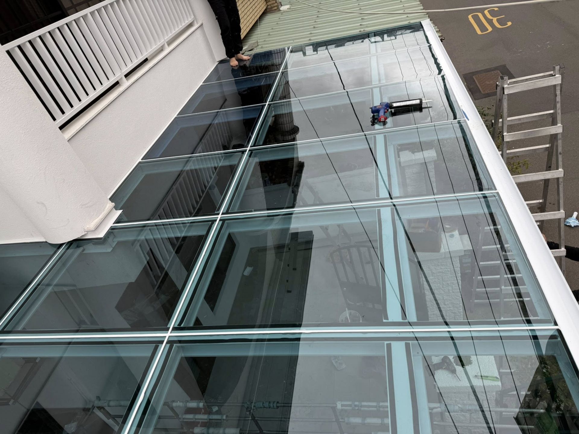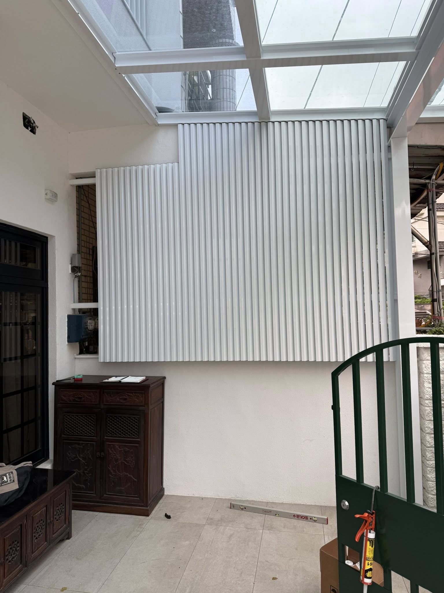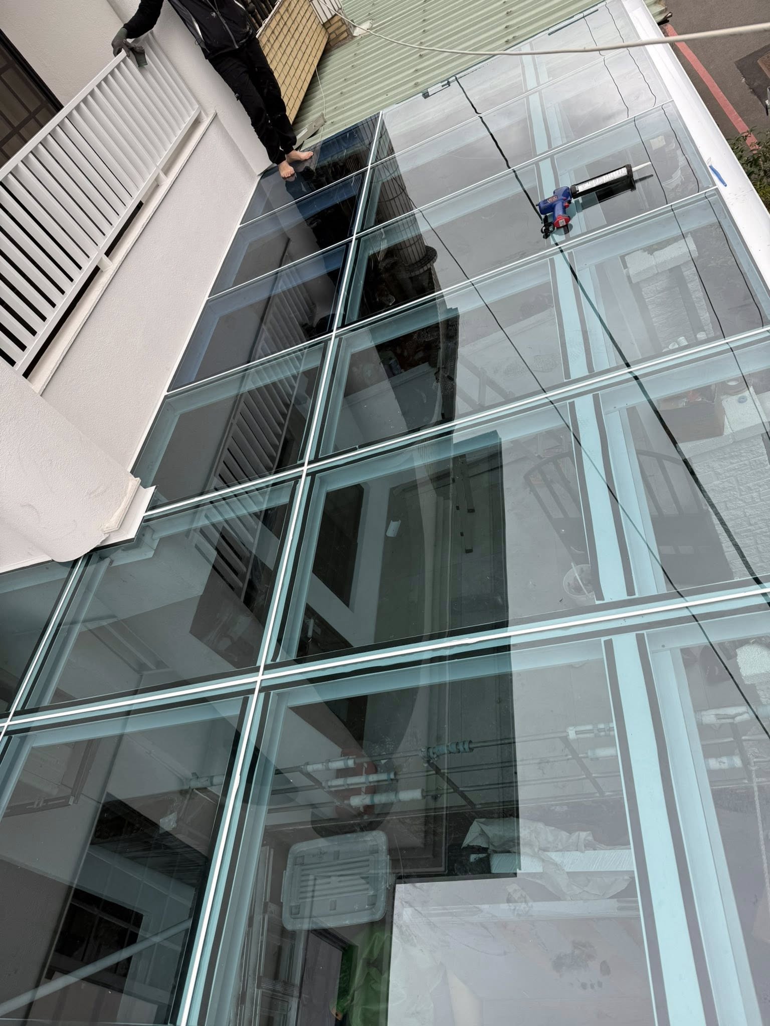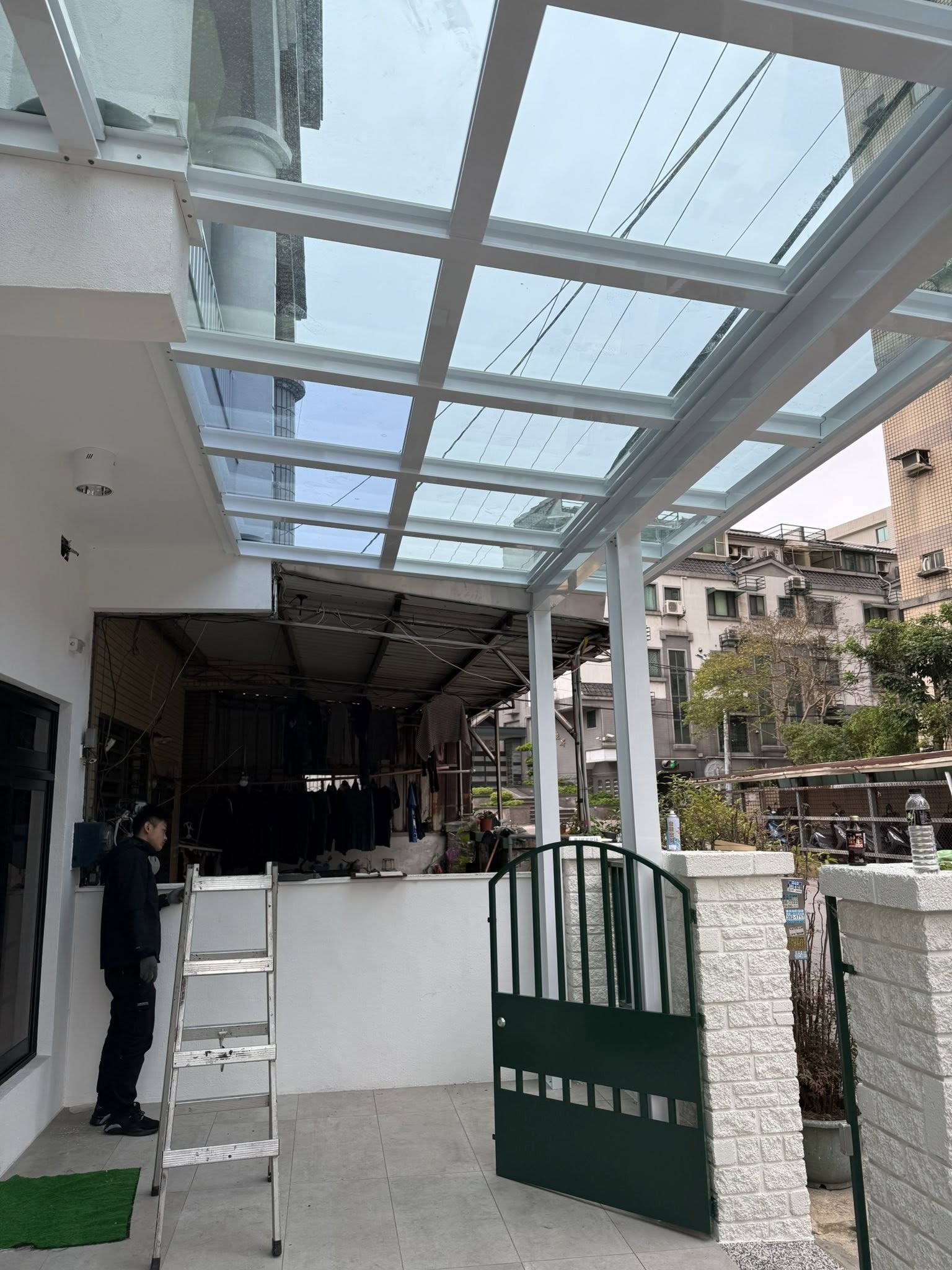 材料搭配方面,以 H型鋁鋼構骨架 作為主要支撐系統,確保結構穩定與施工精準度;外部採用 Low-e膠合玻璃,兼顧採光、隔熱與安全性;再輔以 隱蔽式鋁格柵,修飾收邊與立面層次,達成實用與美感並重的外裝成果。